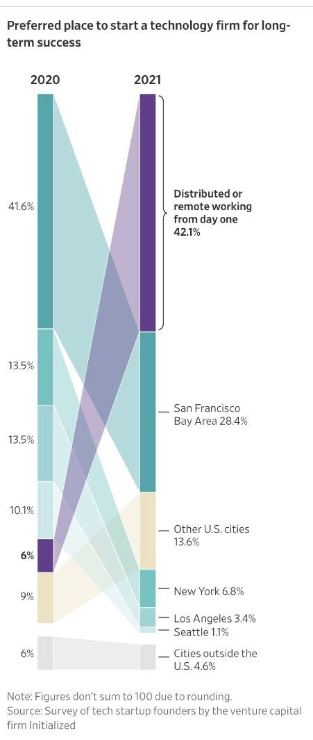• “Remote” non era nemmeno forse da dire prima del Covid e adesso ci sono compagnie di LA o Seattle che si definiscono da subito “remote”. Insomma, “visto che la geografia ha perso rilevanza, intanto inizio dove sono e poi vedremo”.