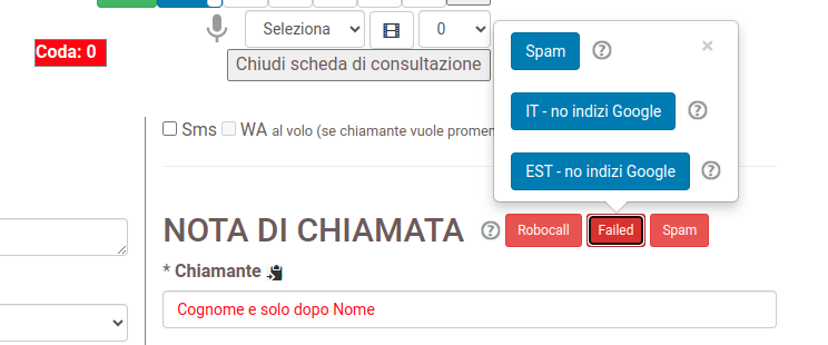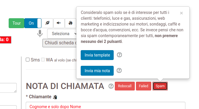• In piattaforma abbiamo creato 3 pulsanti Robocall, Failed e Spam e li usiamo per taggare le chiamate indesiderate in modo che, una volta subita la chiamata per anche 1 solo dei ns clienti, la blocchiamo per sempre a tutti (quindi non solo a chi l’ha ricevuta ma proprio a tutti i nostri clienti).